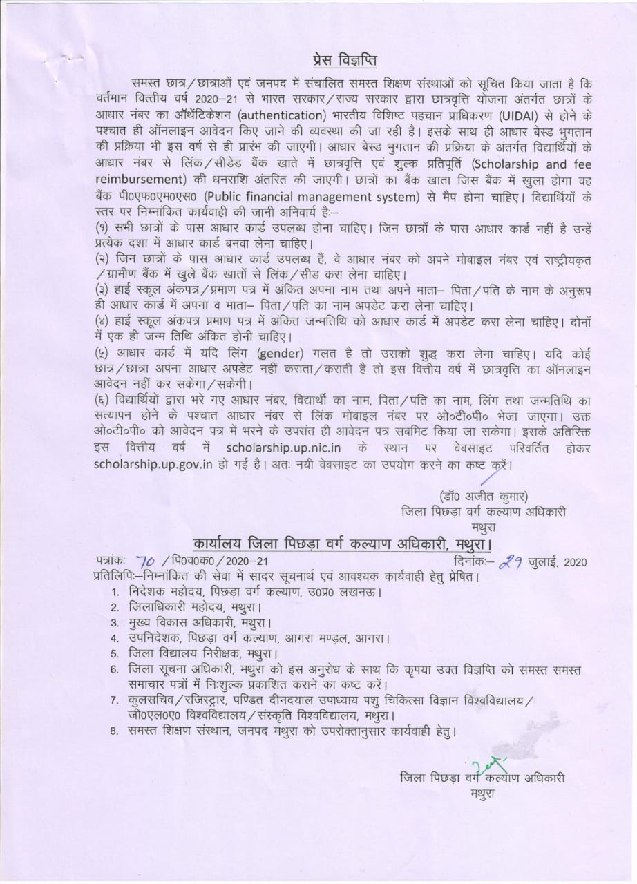 समाज कल्याण  छात्रवृत्ति सत्र 2020-21 योजनान्तर्गत छात्रो हेतु महत्वपूर्ण निर्देश