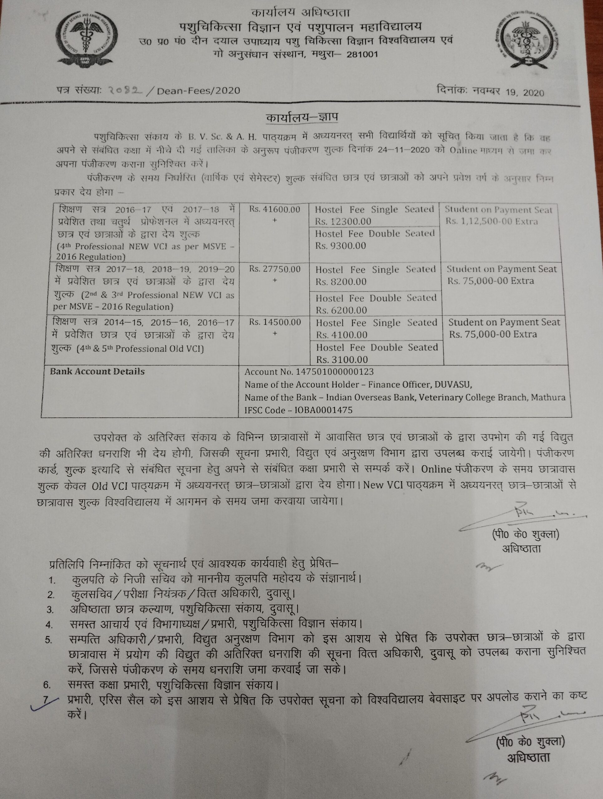 B.V.Sc & A.H. पाठ्यक्रम में अध्ययनरत् विद्यार्थीयों के पंजीकरण शुल्क हेतु